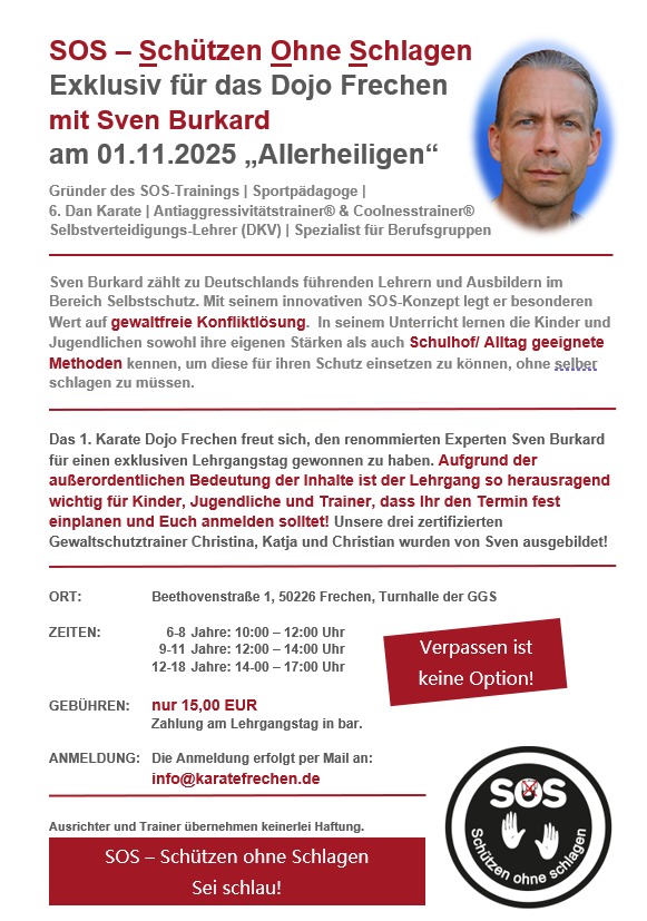 Erlebe die einzigartige Atmosphäre der Frechener Karate-Schule. Lerne Deinen Körper zu beherrschen und Dich innerhalb weniger Wochen selbst zu verteidigen. Finde die Harmonie zu Deinem Körper, die das alltägliche Leben einfacher und bewusster macht und genieße das freundschaftliche Miteinander bei uns.